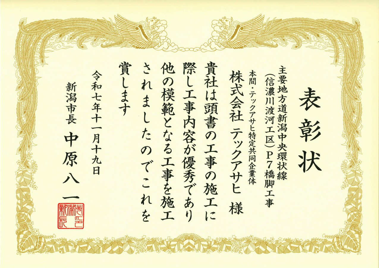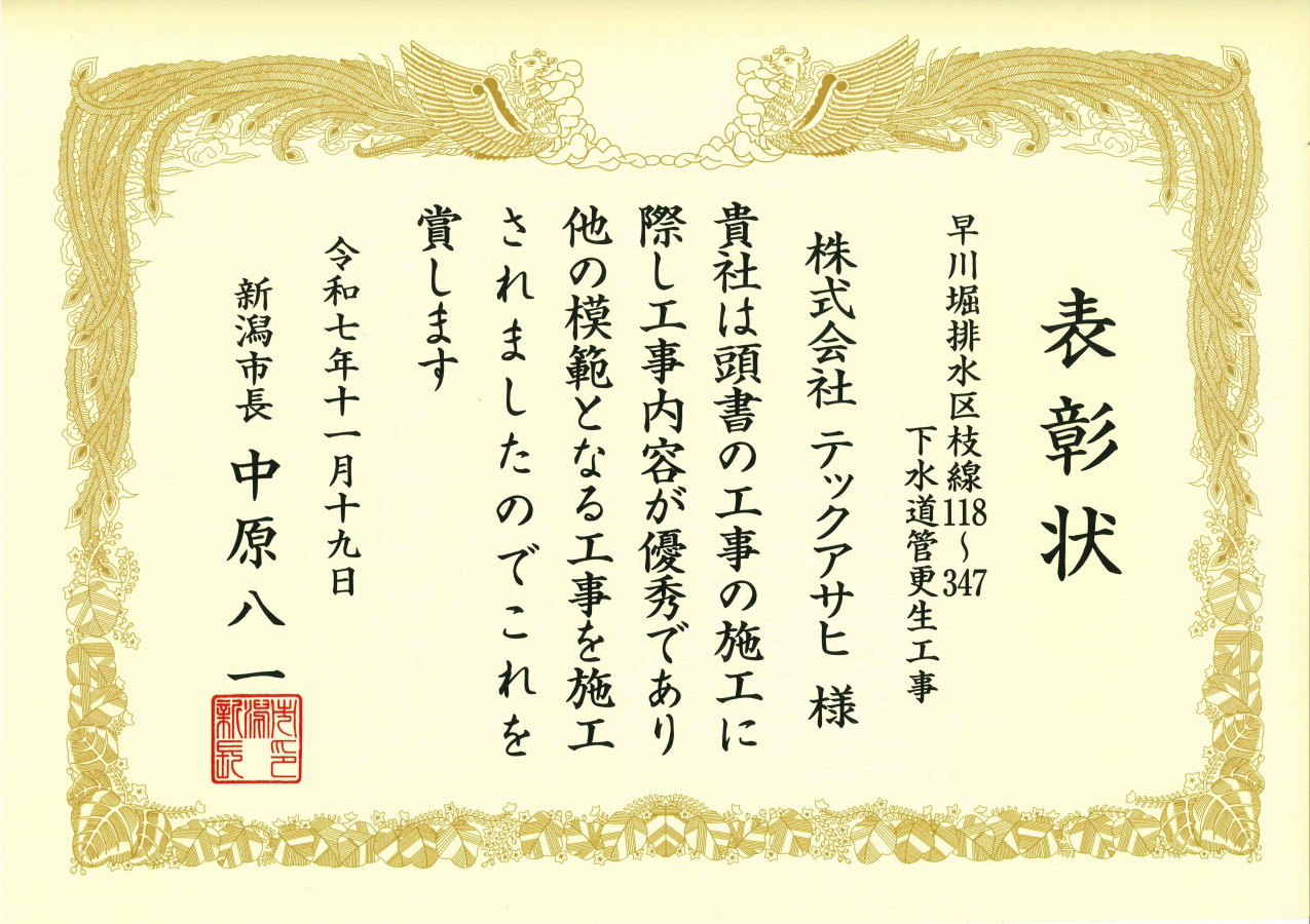 令和6年度 主要地方道新潟中央環状線(信濃川河渡工区)P7橋脚工事 令和5年度 早川堀排水区枝線65~67下水道管更生工事 令和元年度 早川堀排水区枝線103-5~103-6下水道管更生工事 平成29年度 新潟第4処理分区枝線145G~145P下水道工事 平成27年度 葛塚排水区雨水貯留管下水道工事 平成24年度 新潟市白根水道町ポンプ場建設工事その3工事 (施工:佐藤・テックアサヒ特定建設企業体) 優良工事表彰状 すべての工事実績 令和6年度 元請実績 下請実績 令和5年度 元請実績 下請実績 令和4年度 元請実績 下請実績